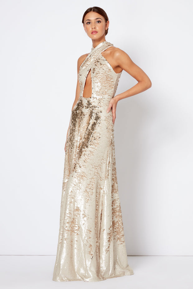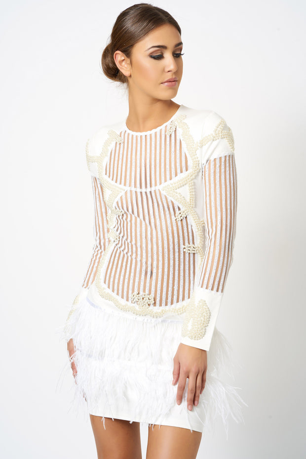This fun party dress has long sleeves, a neck that zips up with a discreet zipper at the back, a bodycon mini cut, and glitzy gems arranged all over in an elaborate palm tree design. Put on your party shoes and dust off your best moves, ‘cos it’s showtime.
