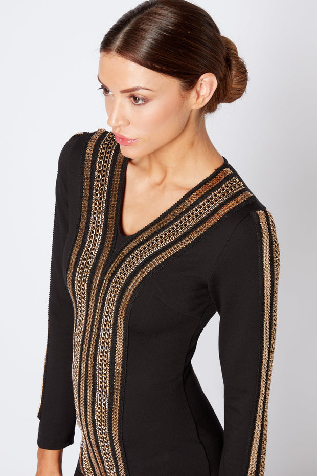 You've got a lust for the finest things in life- The Club L Off the Chain Bodycon Dress is a super luxe power dress. Featuring a long sleeves and a v plunge neckline this figure hugging bodycon has chain detailing expertly placed to enhance your silhouette.