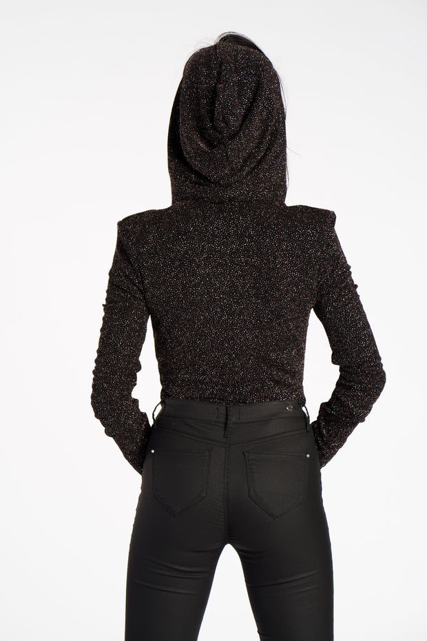 features super sparkly glittery lurex, padded shoulders, a thong snap closure, and a hood for added sass.